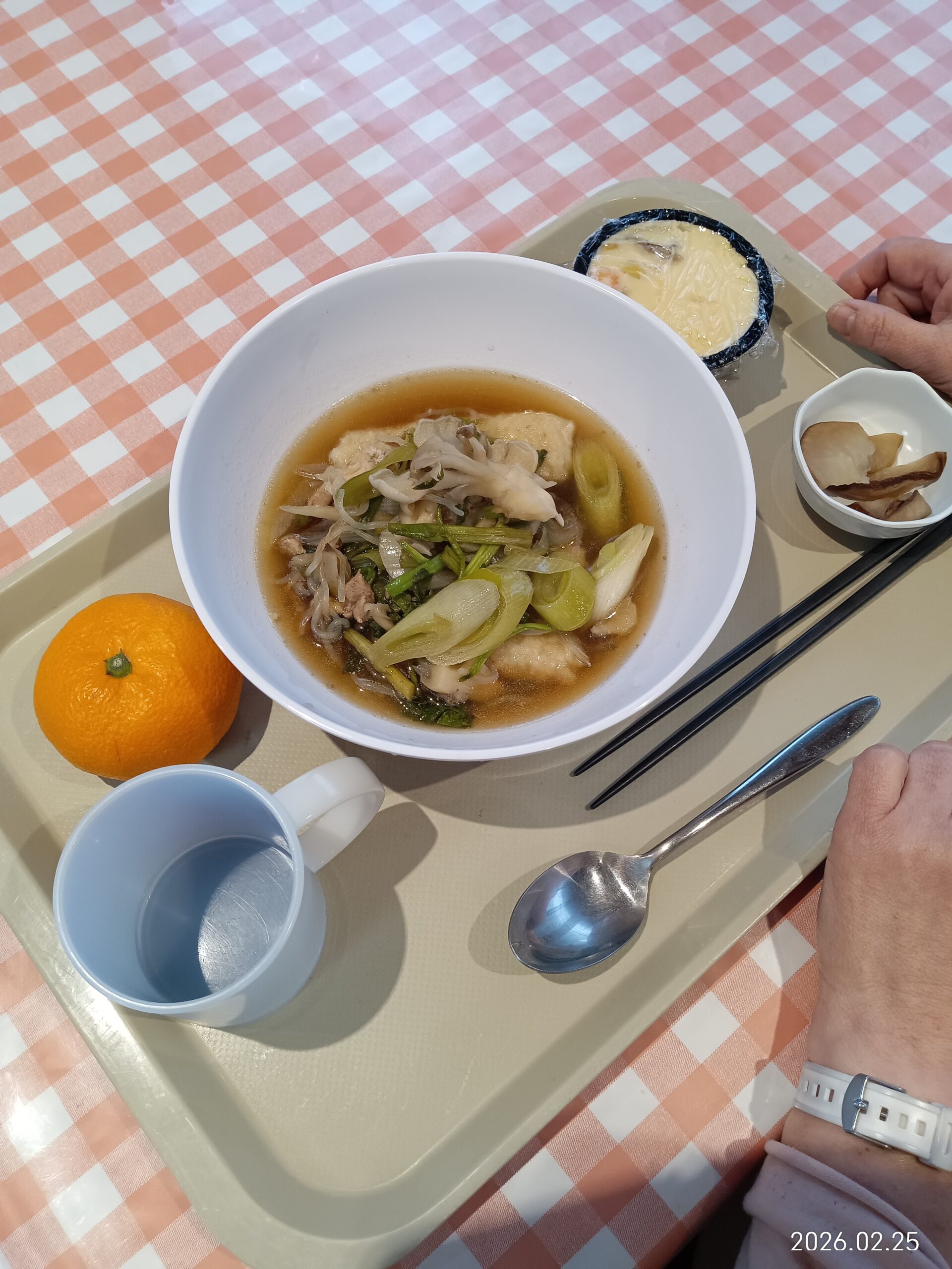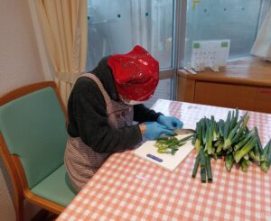 前日から大きな鍋で比内鶏がらのだしを取り,当日,ご利用者の皆さんにたくさんの鶏肉とネギやゴボウ・白滝を切ってもらい,煮込みました。みんなでお昼にいただきました。