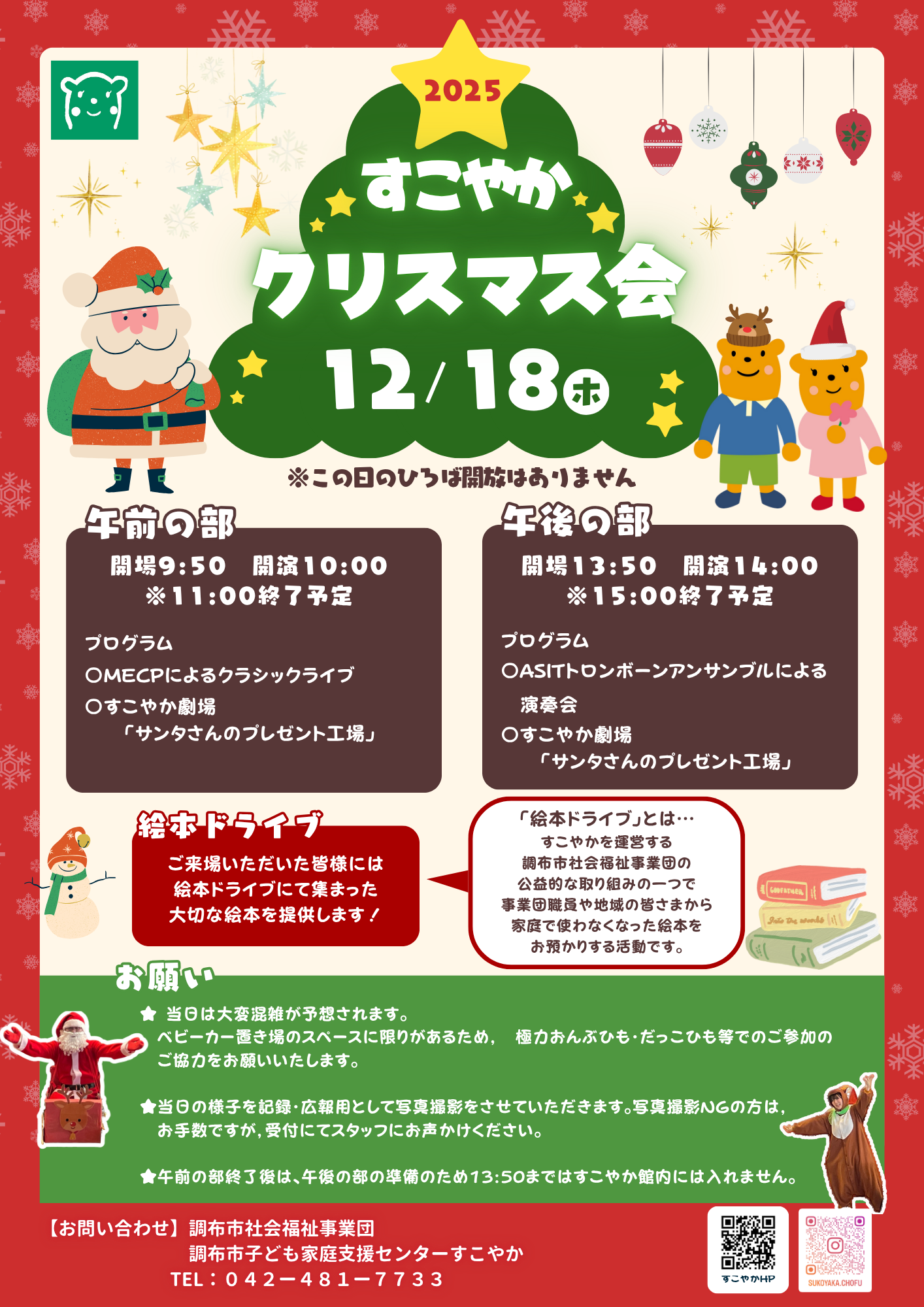 また,午前の部終了後は、午後の部の準備のため13:50まではすこやか館内には入れません。あらかじめご了承ください。