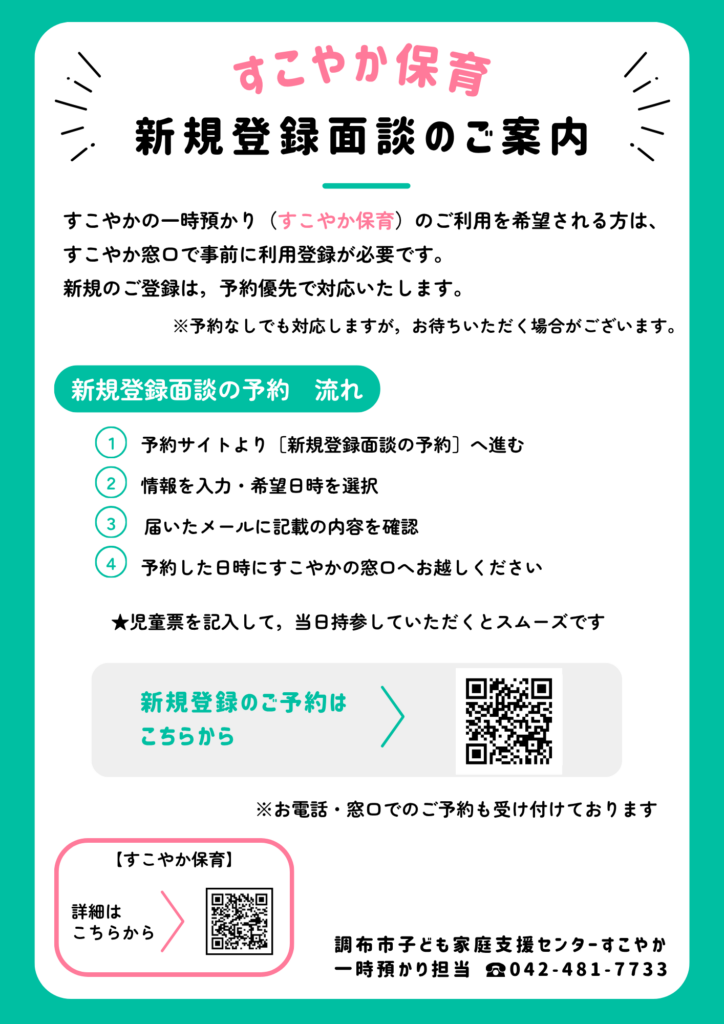 すこやか保育のご利用には事前登録が必要です。新規登録は予約優先で対応いたします。予約なしでも対応いたしますが,職員が不在時にはお待ちいただく場合がございます。